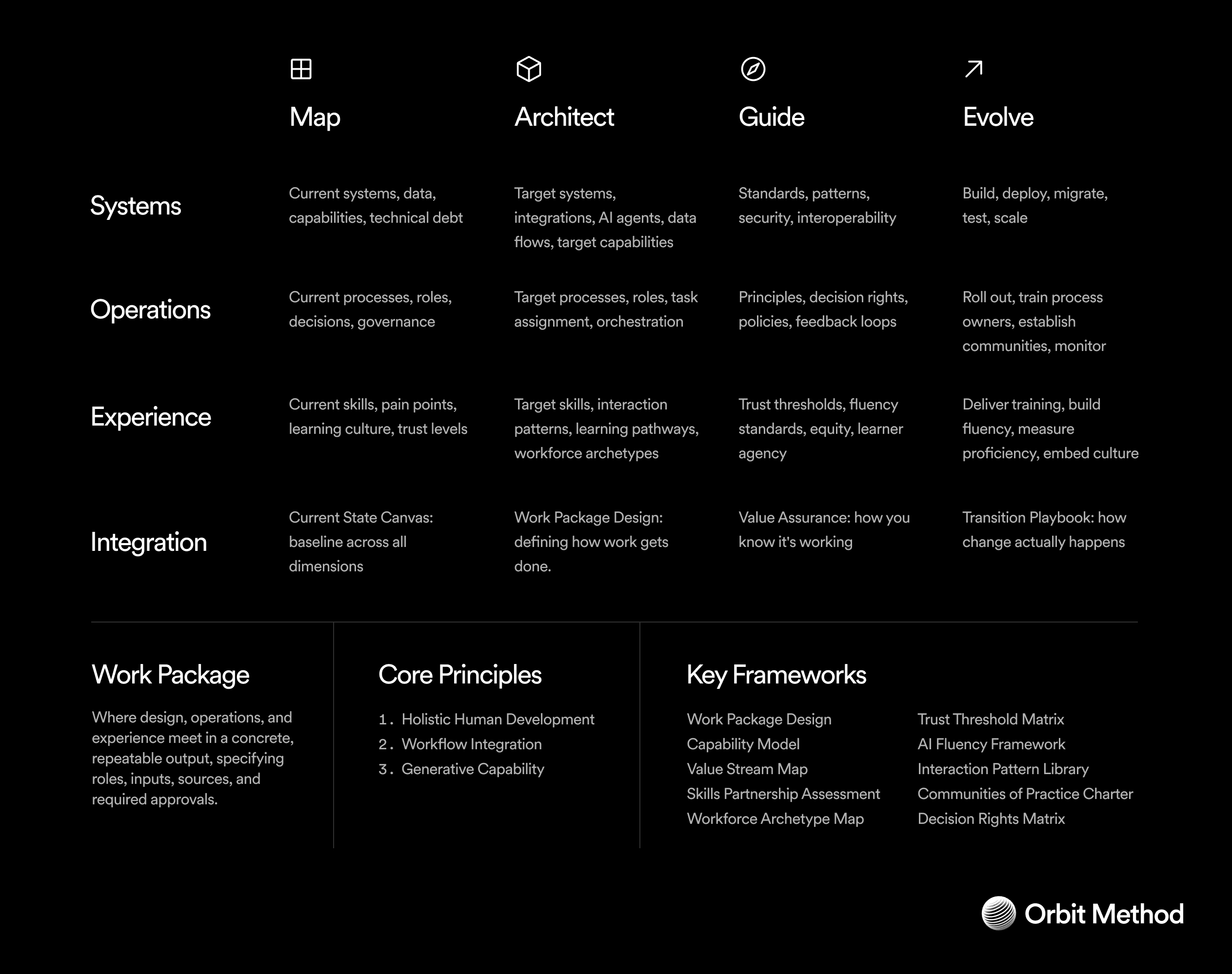 Orbit is a transformation method for redesigning how humans and AI work together. It unifies design, operations, and experience into a single coherent approach. Through four phases (Map, Architect, Guide, Evolve) it guides organizations from understanding their current state to designing and embedding new ways of working with AI. Each phase includes an integration framework that brings the three dimensions together: Current State Canvas, Work Package Design, Value Assurance, and Transition Playbook.