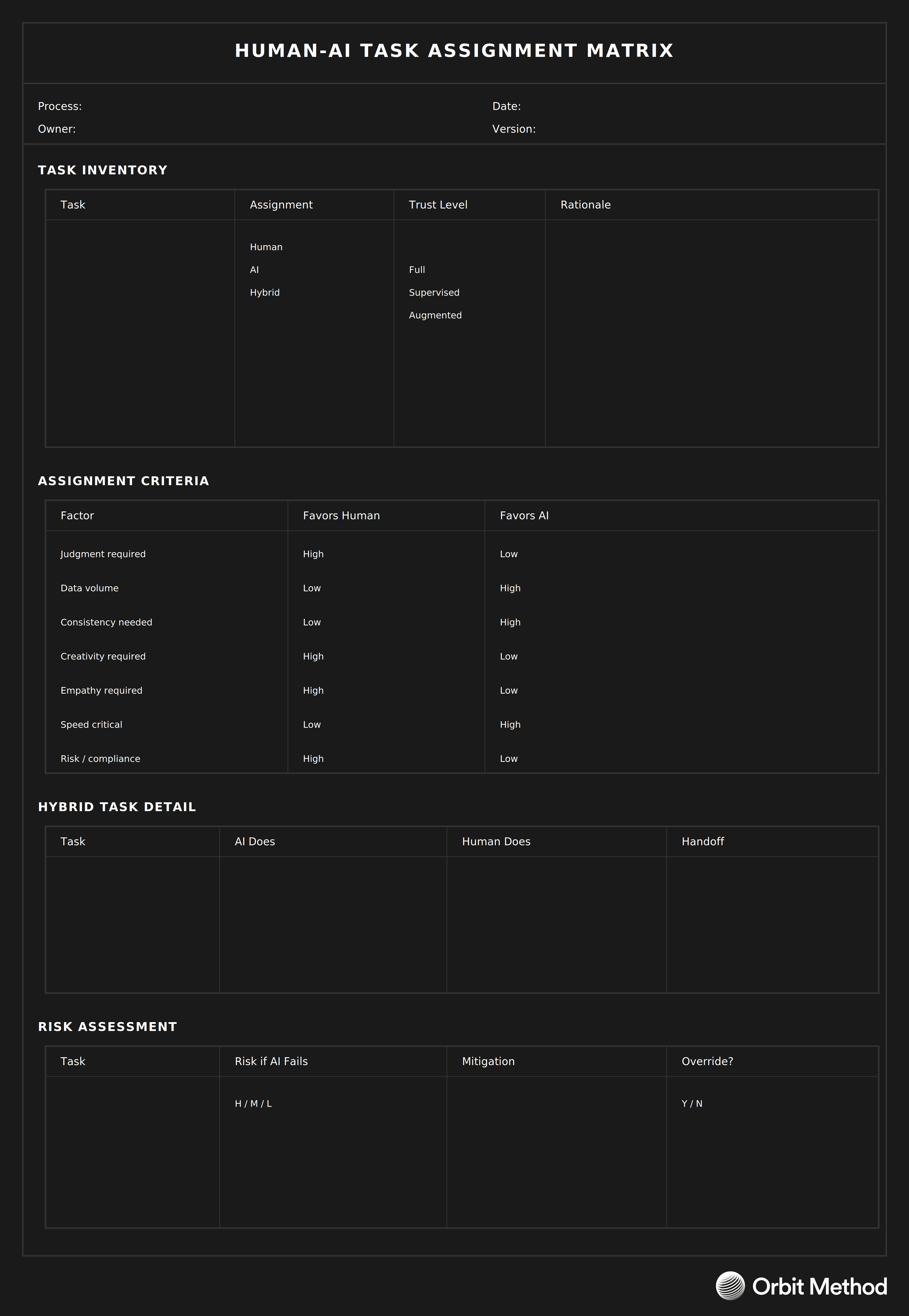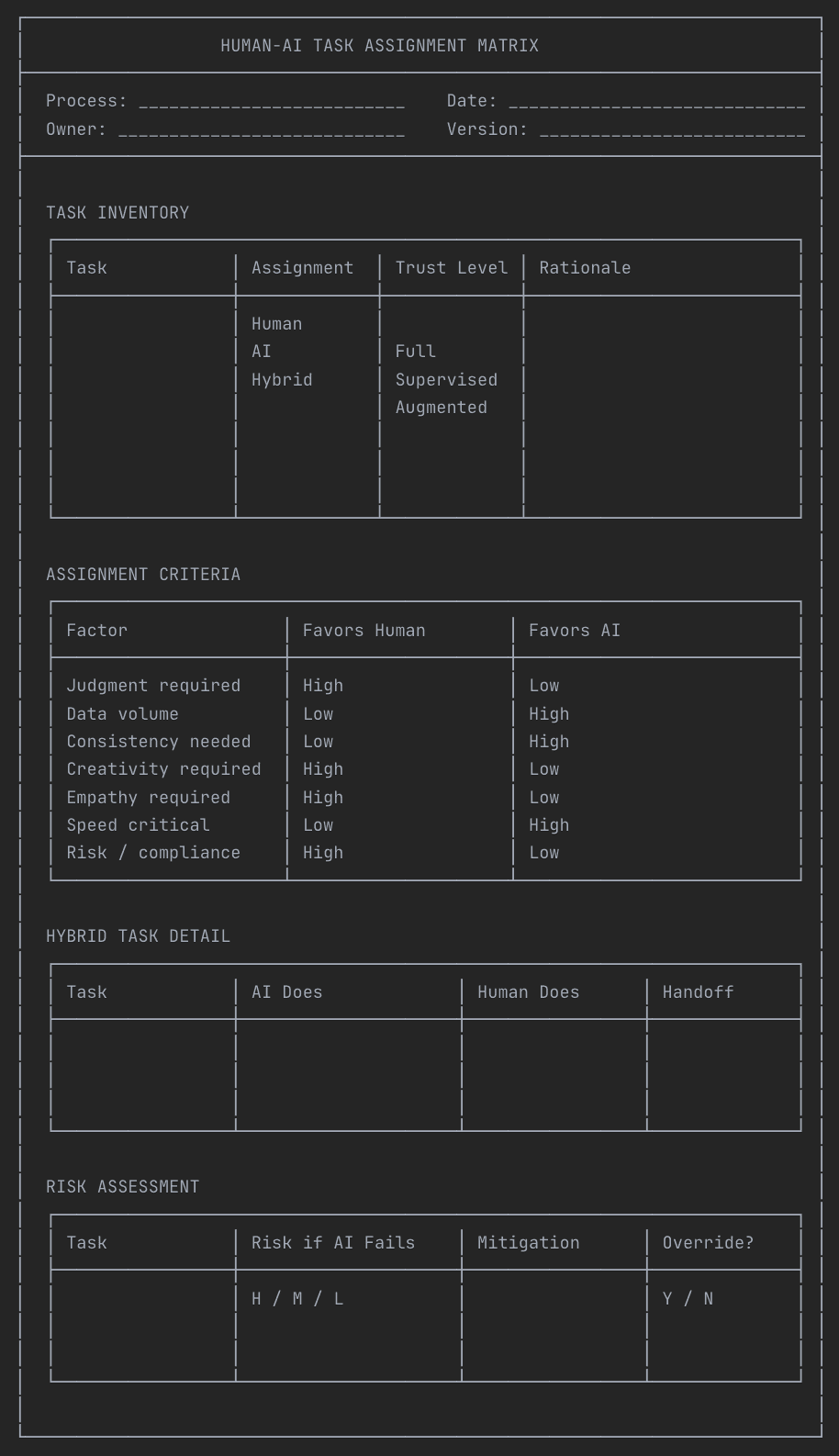 Not every task should be automated. This matrix makes explicit choices about human-AI division of labor based on value, risk, complexity, and the unique strengths of humans and AI.