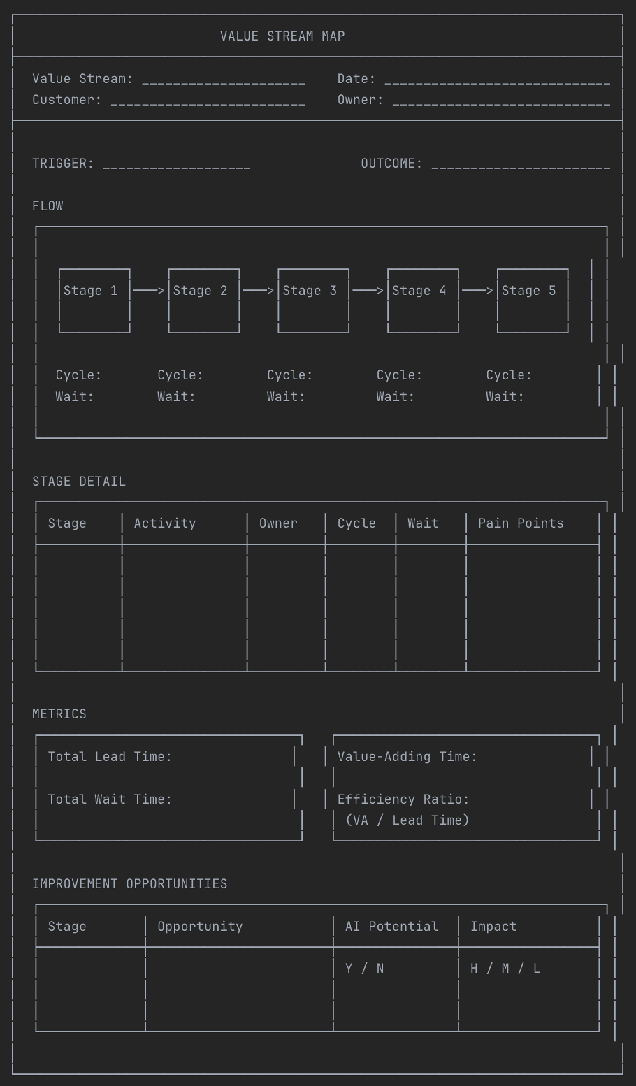 Value streams show the end-to-end flow of work that delivers value to customers. Mapping them reveals bottlenecks, unnecessary handoffs, and waste, providing the foundation for process redesign and AI integration.