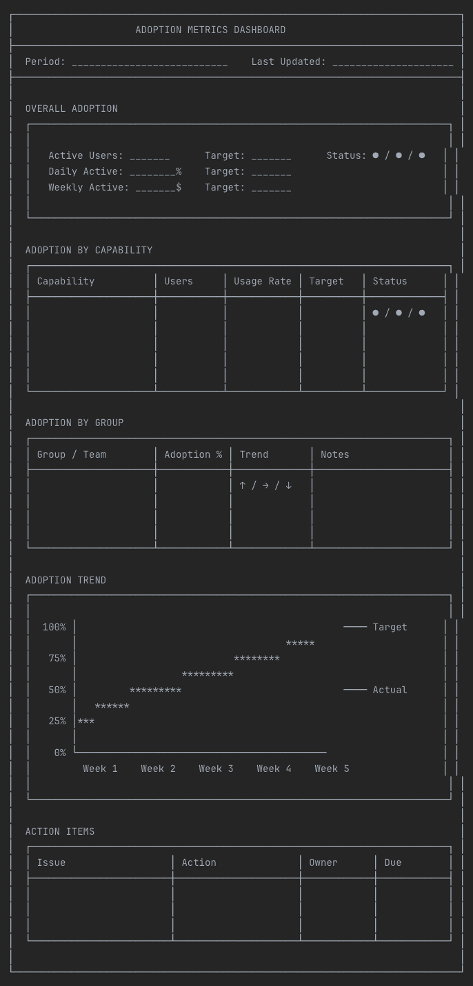 Adoption tells you if transformation is taking hold. This dashboard provides visibility into who's embracing new capabilities and where additional support is needed.