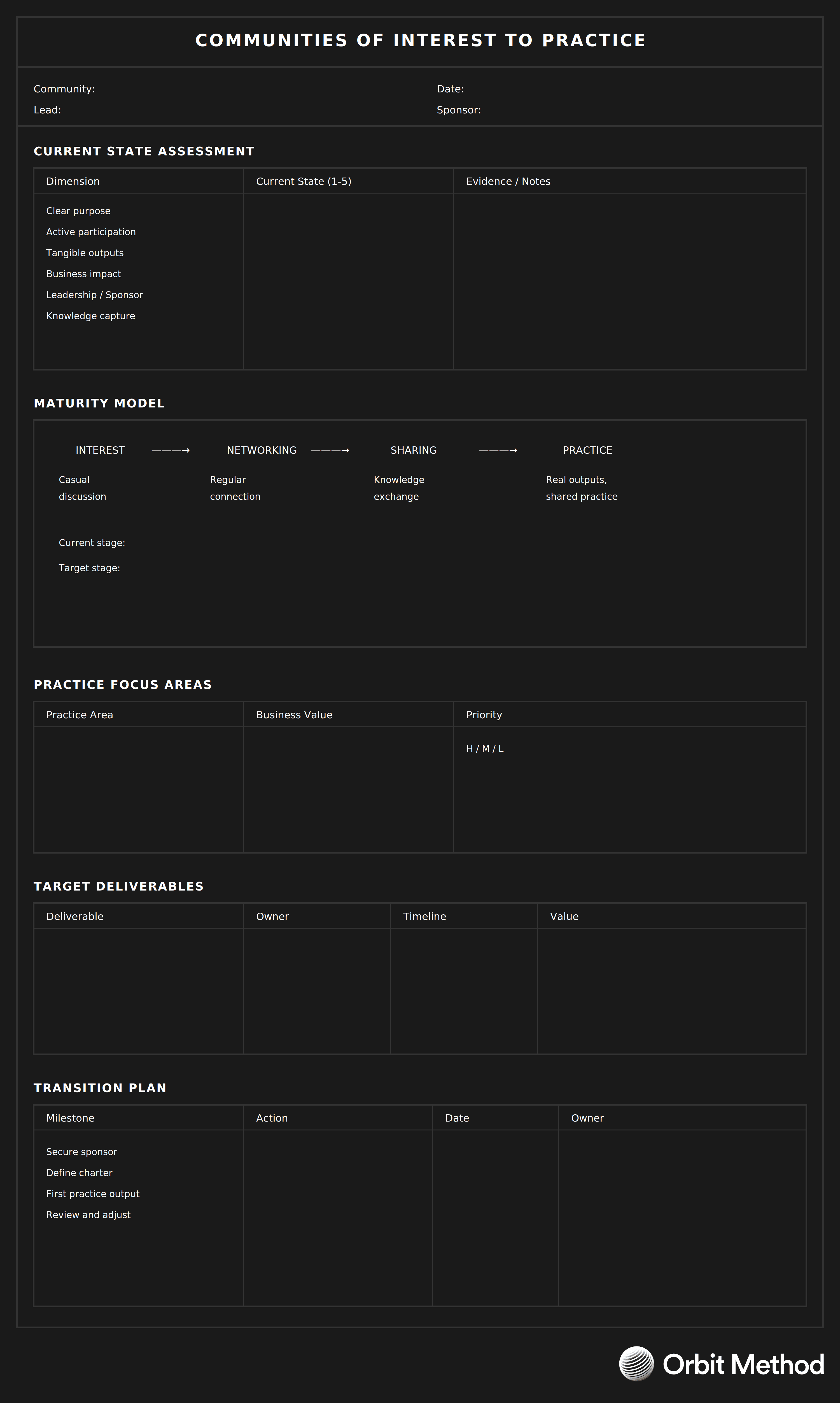 Interest groups generate energy but not always results. This exercise helps convert informal interest into structured practice communities with clear outcomes.