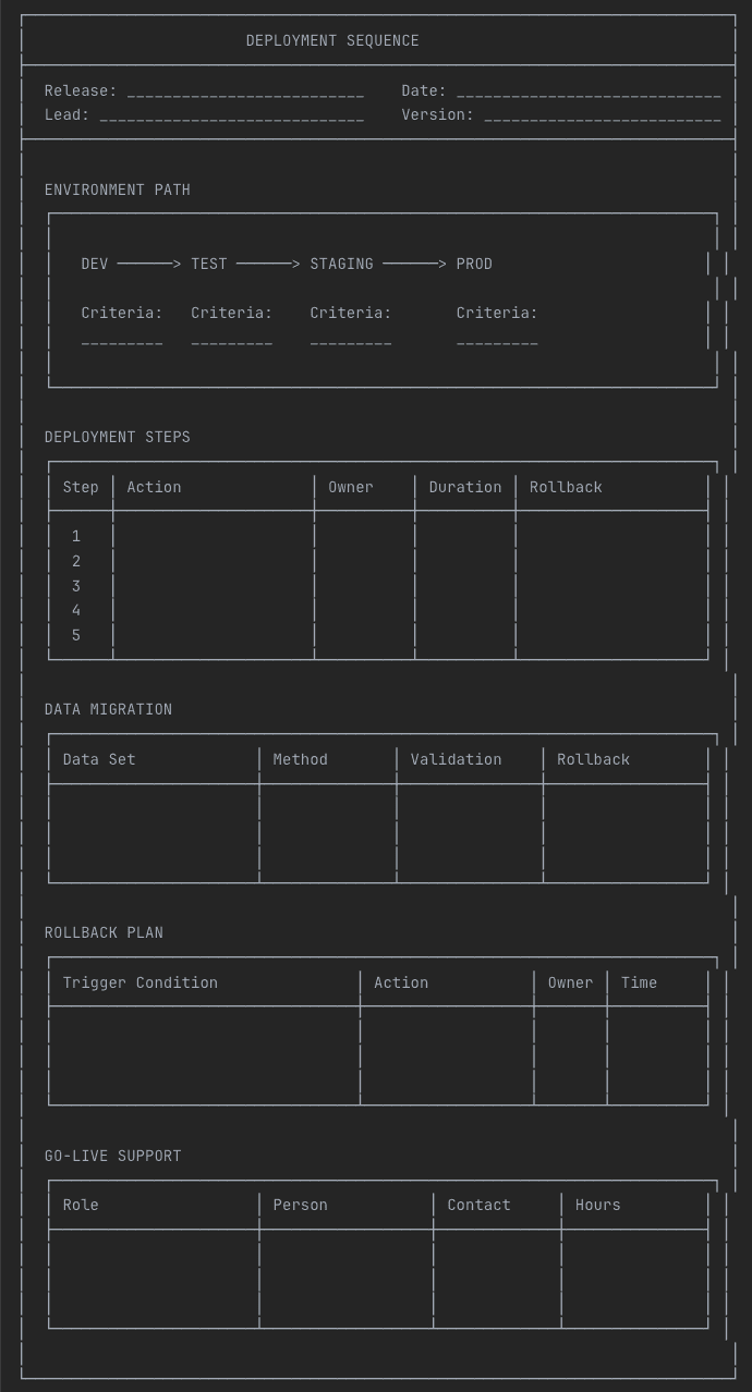 Deployment is where design meets reality. This sequence ensures smooth rollout with minimal disruption, clear responsibilities, and fallback options if things go wrong.