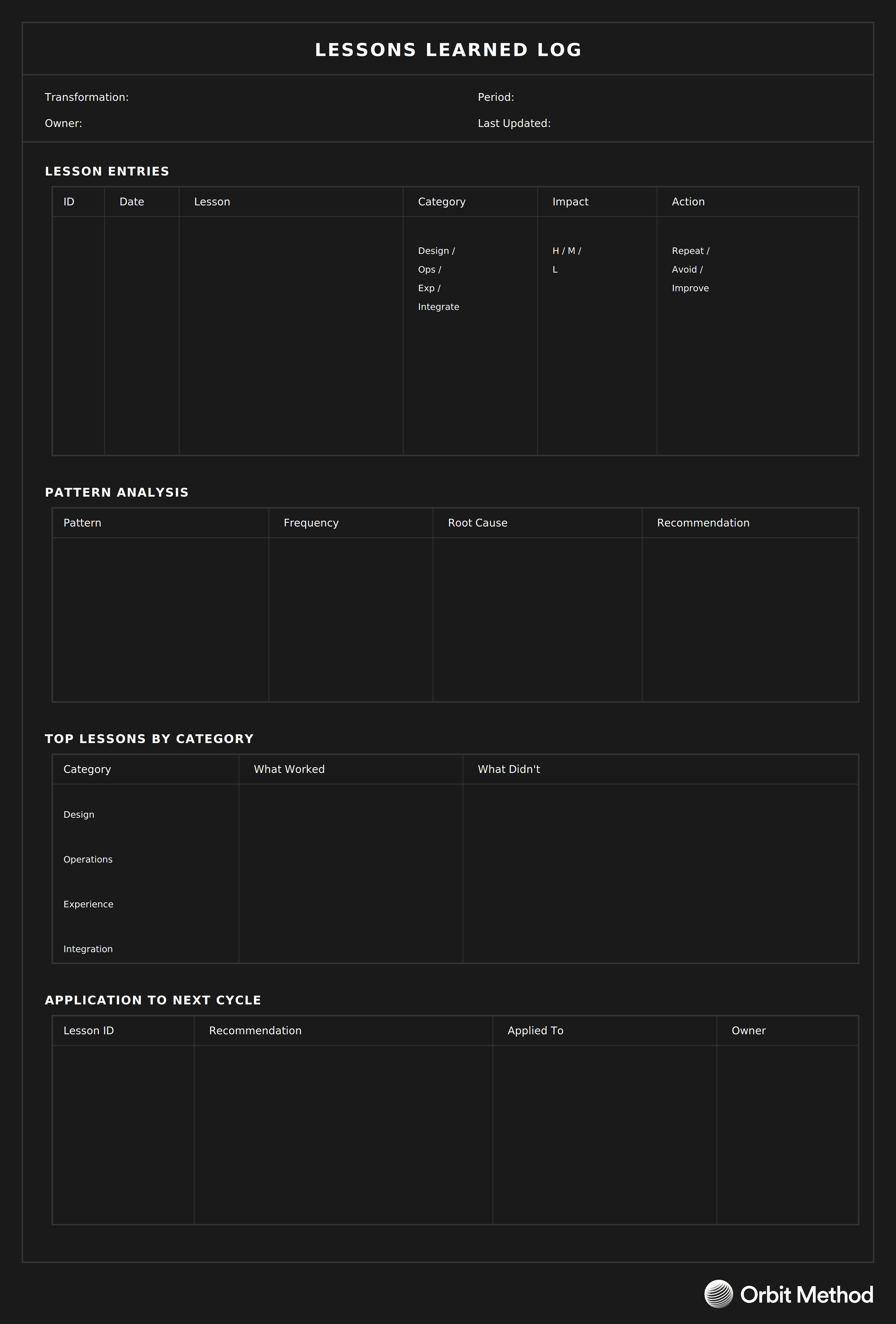 Every transformation generates lessons. This log ensures they're captured systematically and applied, not lost when the project ends.
