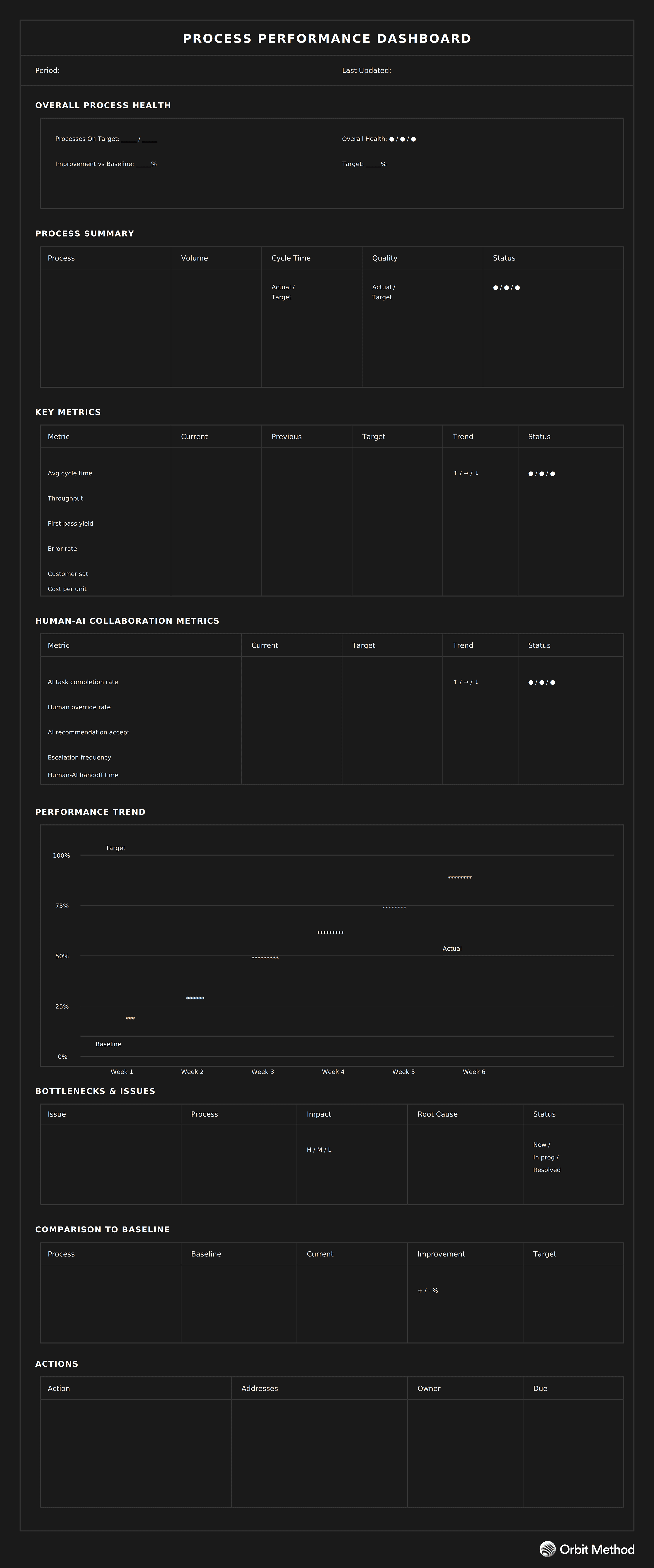 Process redesign only matters if it delivers results. This dashboard monitors how transformed processes are actually performing, enabling continuous optimization and rapid response to issues.