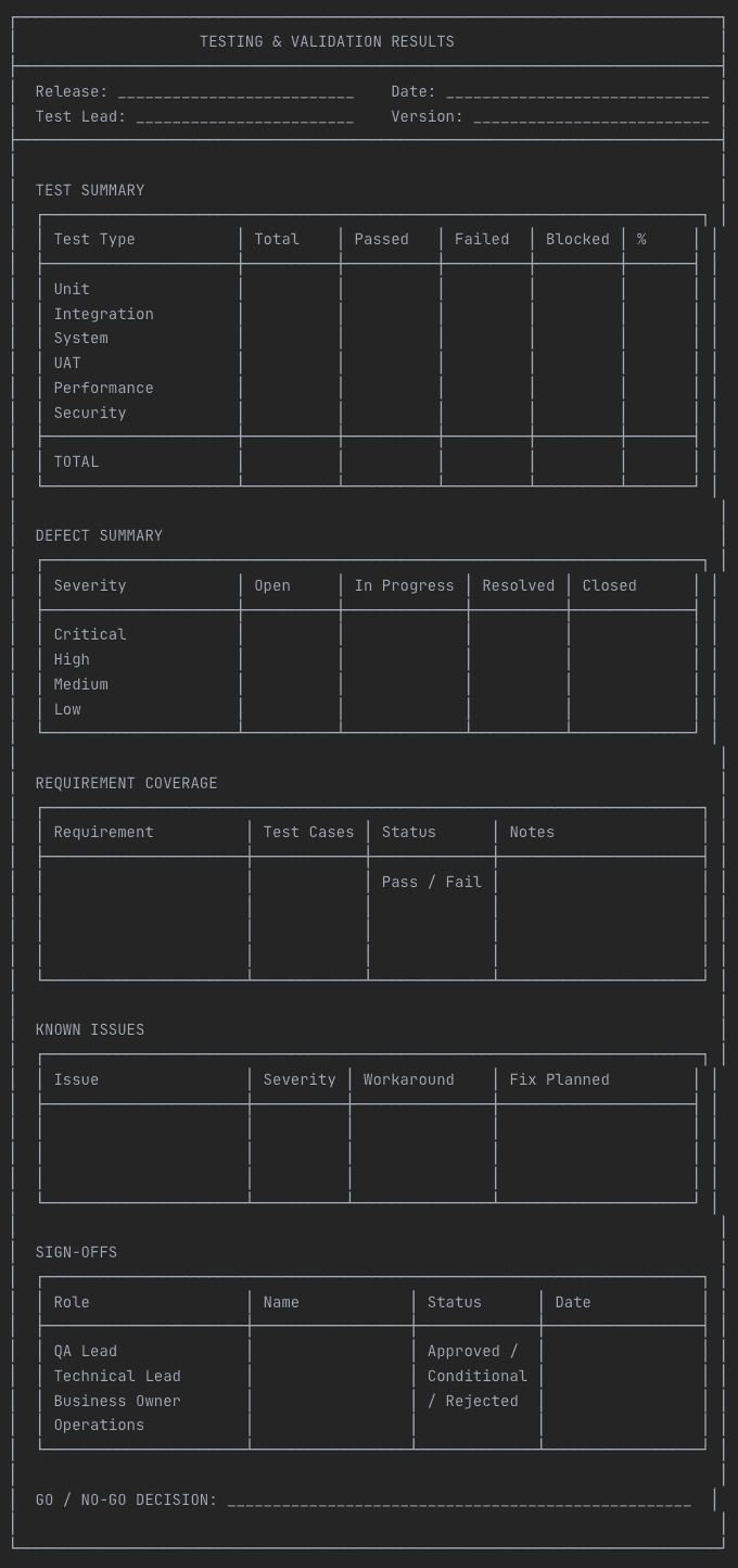 Testing validates that what was built matches what was designed. This documentation provides the evidence for go/no-go decisions and creates a record for future reference.