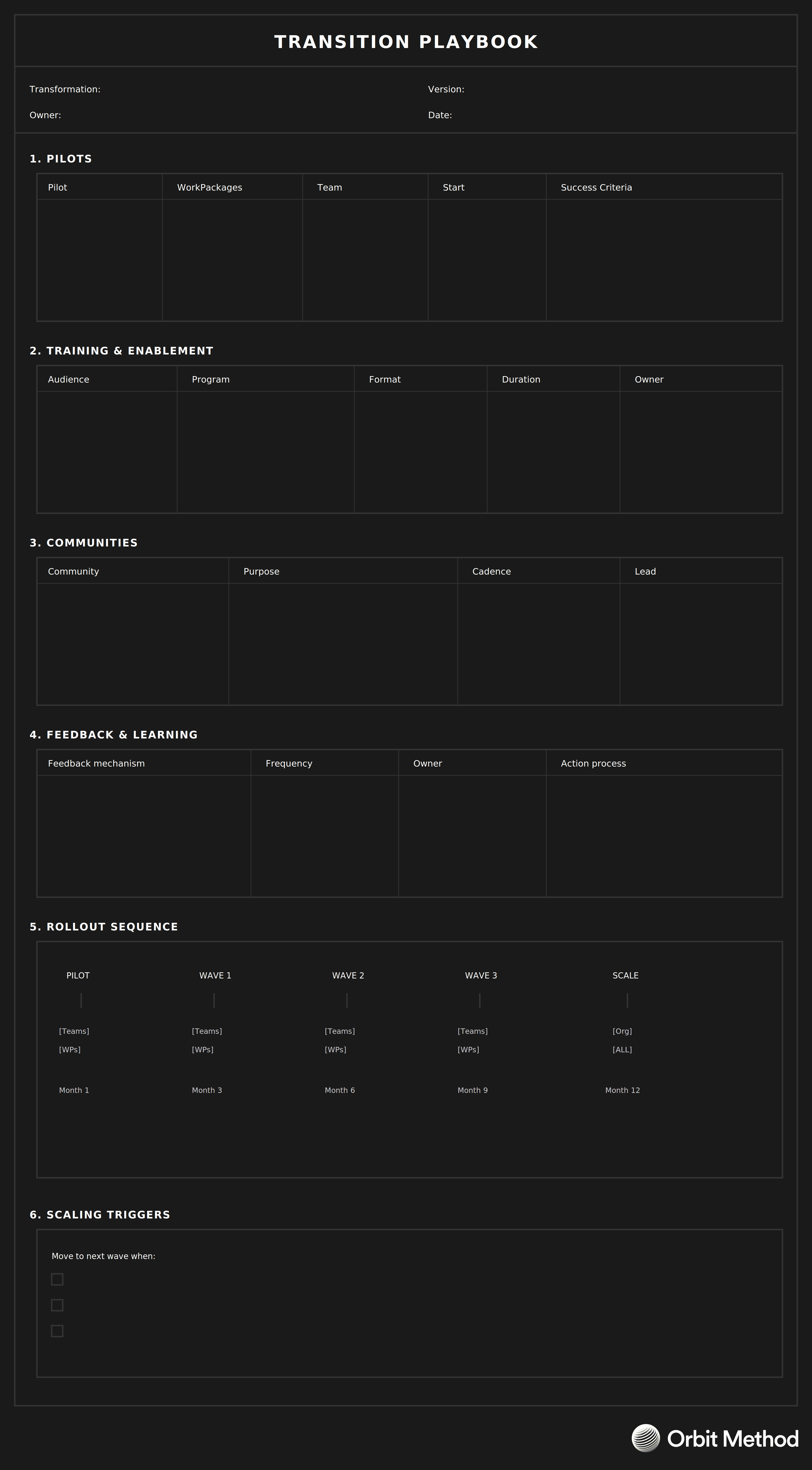 Transformation fails in execution, not design. The Transition Playbook brings together pilots, training, communities, and feedback mechanisms into a coherent plan for making change stick.