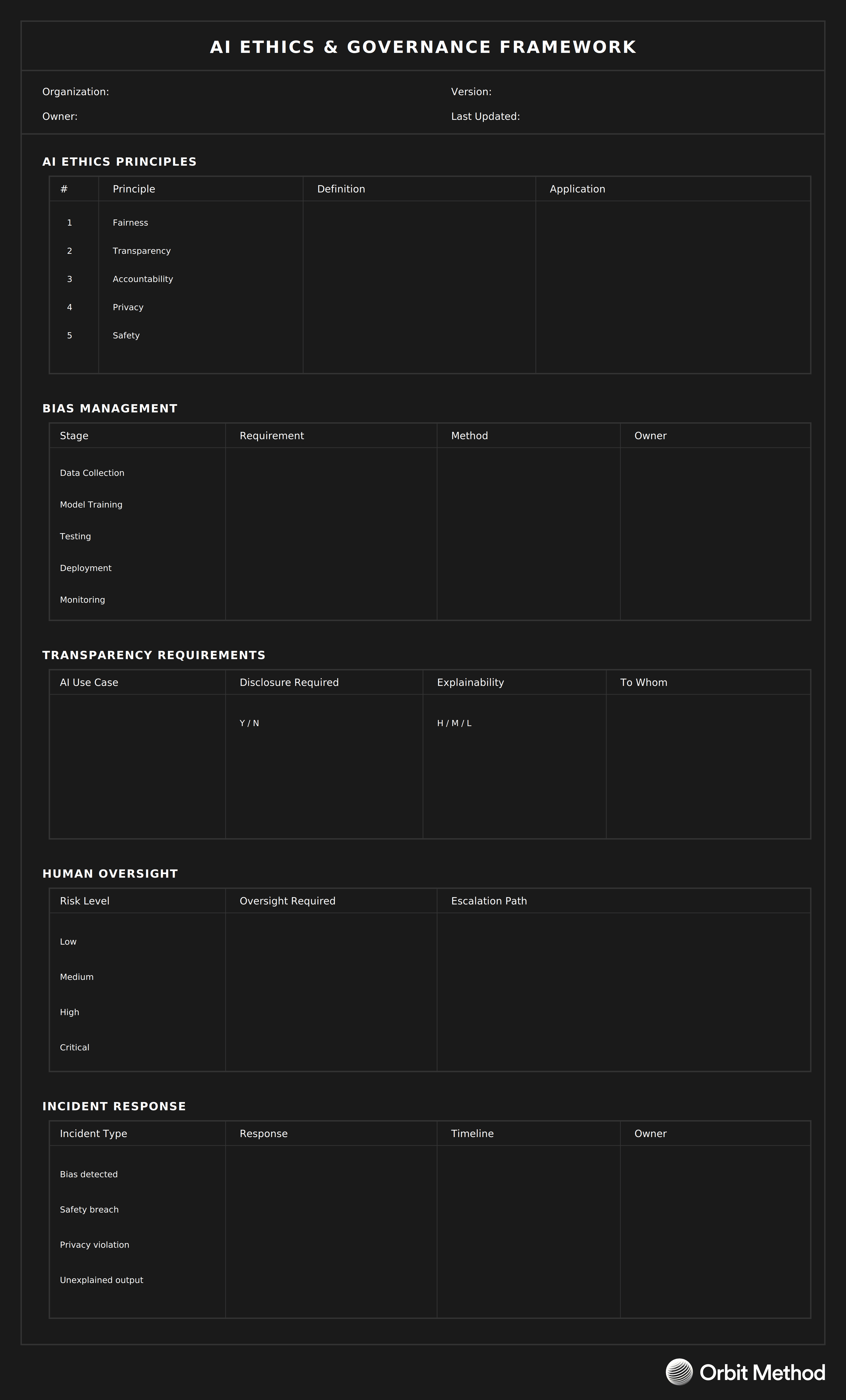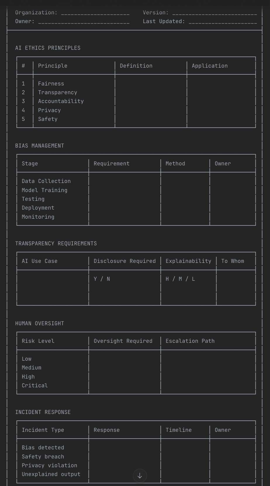 AI introduces new risks. These guidelines establish how the organization will develop and deploy AI responsibly, protecting people, customers, and the business from unintended harm.