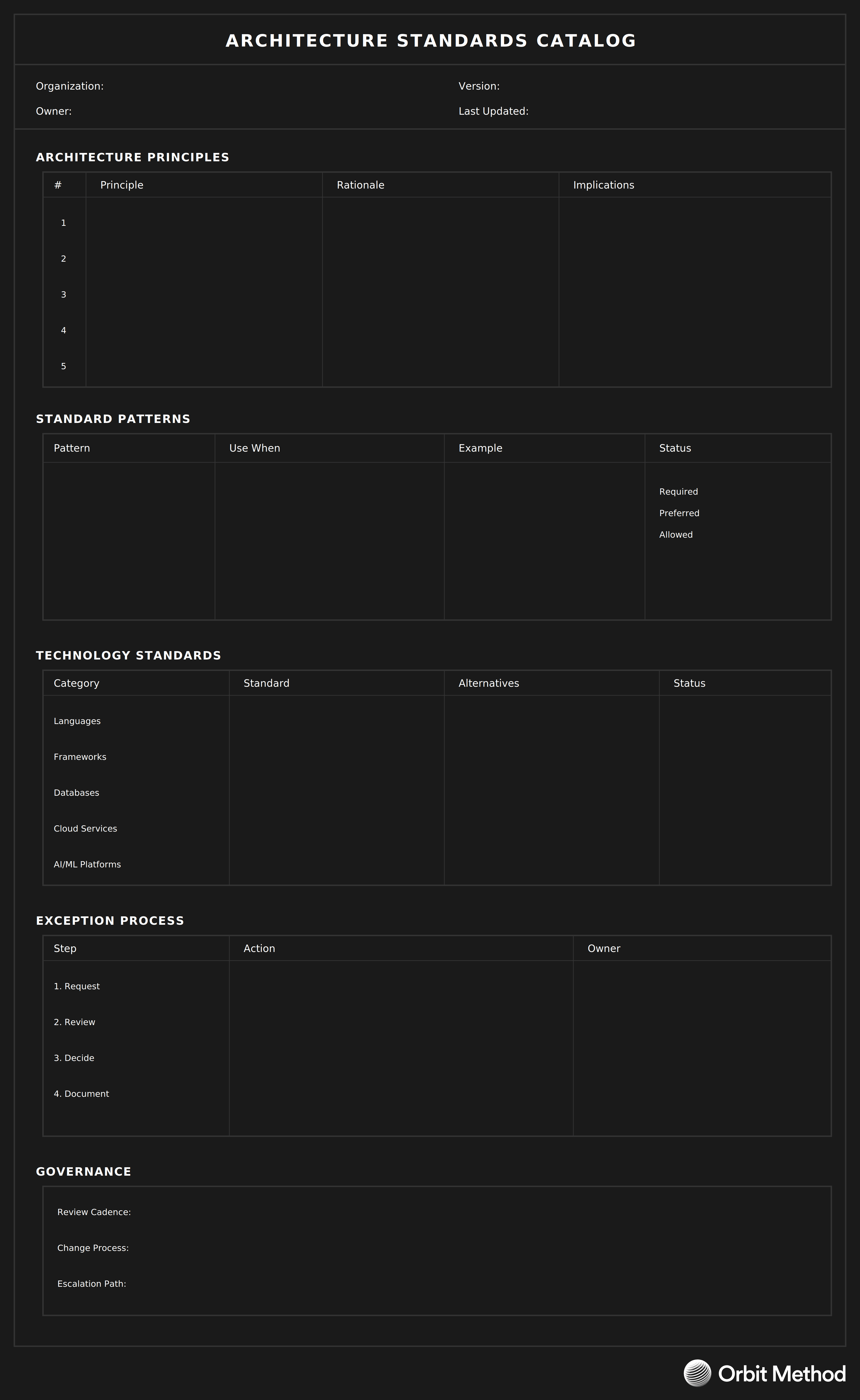 Standards prevent chaos without stifling innovation. This catalog establishes the patterns and principles that guide technical decisions, ensuring coherence as teams work independently.