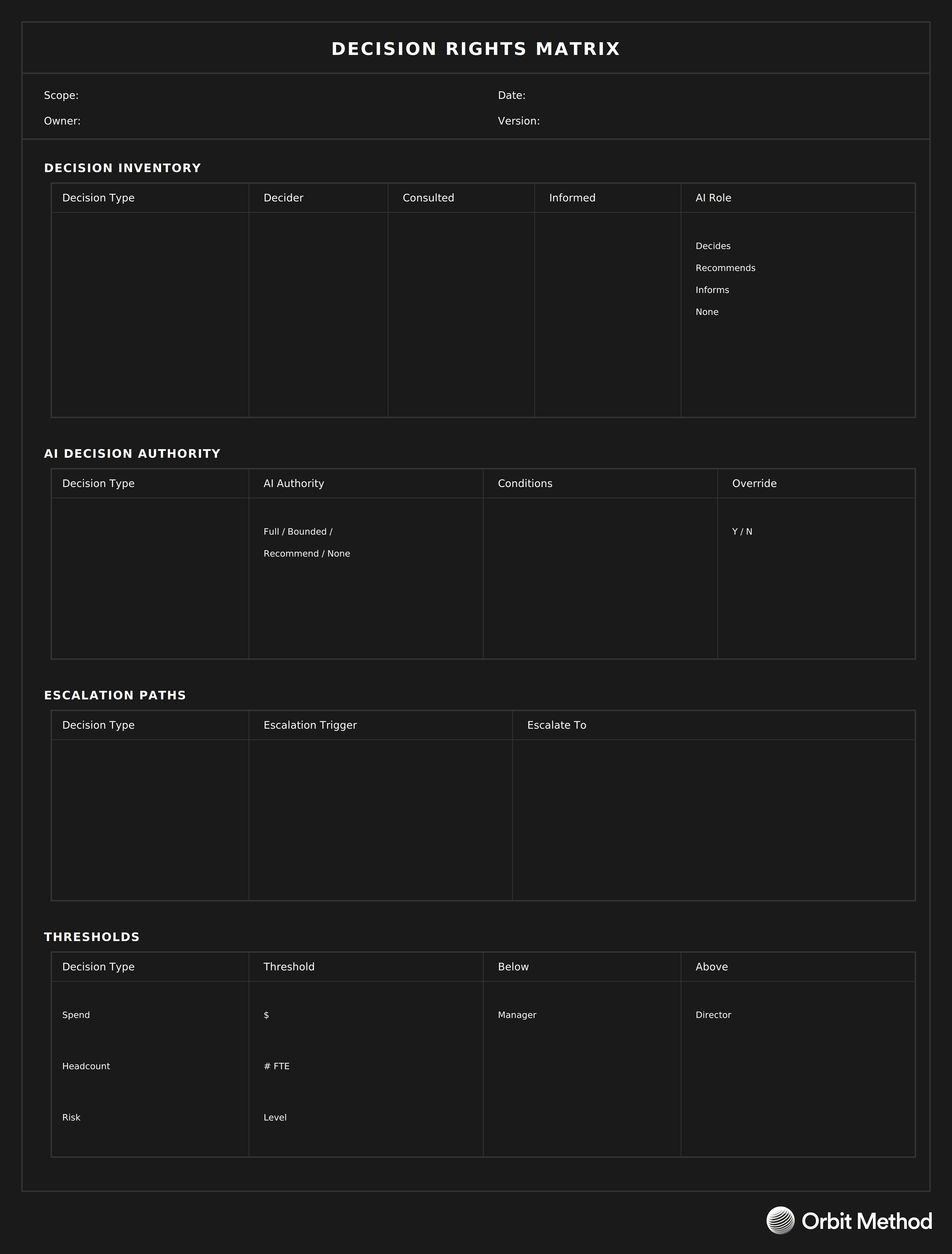 Clarity on decision rights prevents bottlenecks, confusion, and conflict. This matrix makes explicit who decides what, including the role of AI in decision-making.