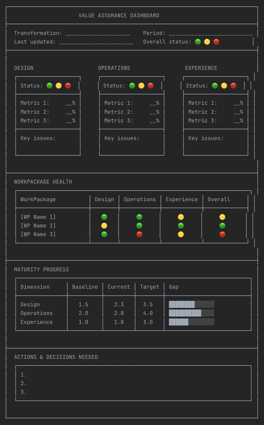 Governance without measurement is guesswork. Value Assurance provides a structured way to track whether your transformation is working across design, operations, and experience, surfacing issues before they become failures.