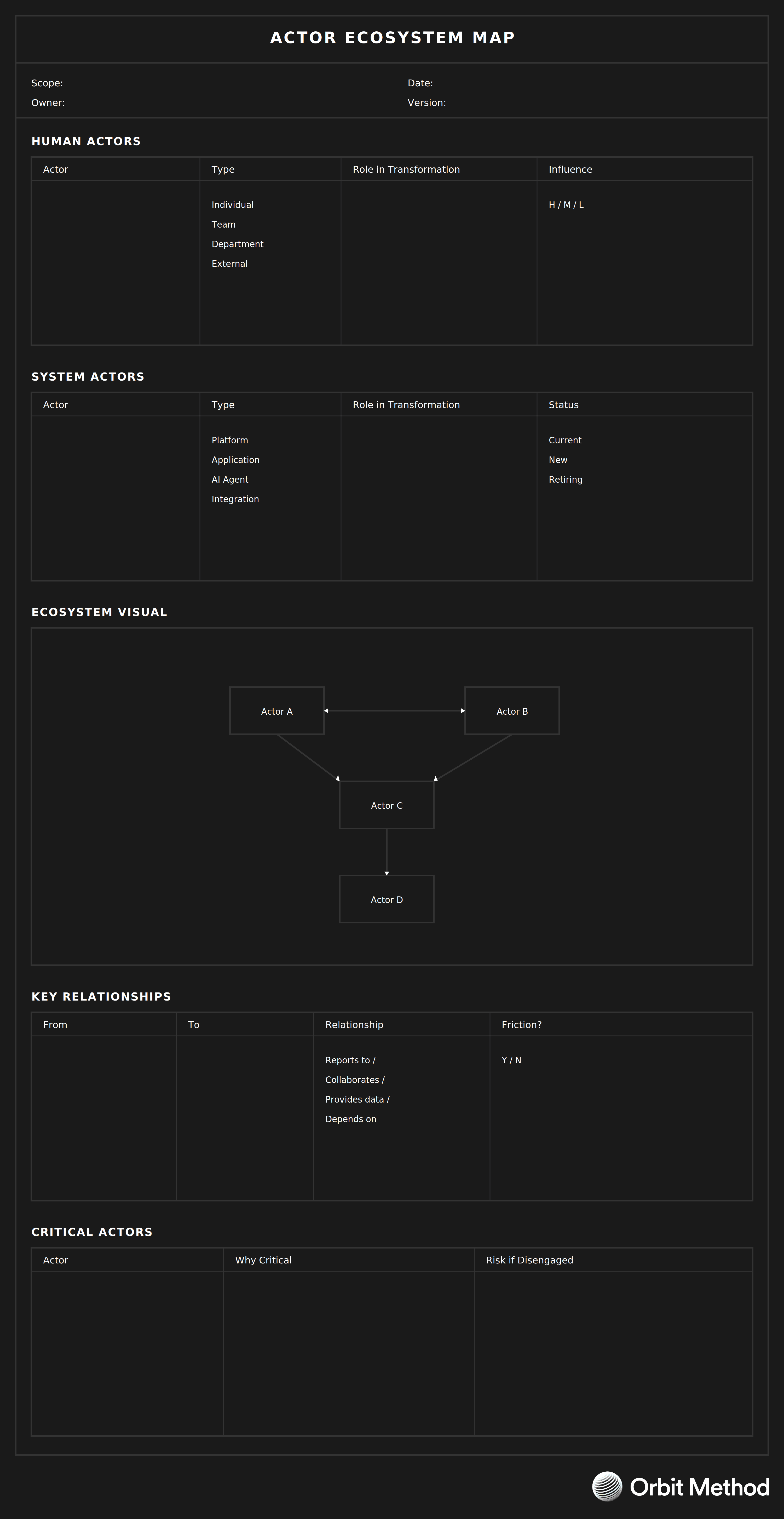 Transformation involves many actors. This map makes visible who and what is involved, revealing relationships, dependencies, and potential conflicts that must be managed.