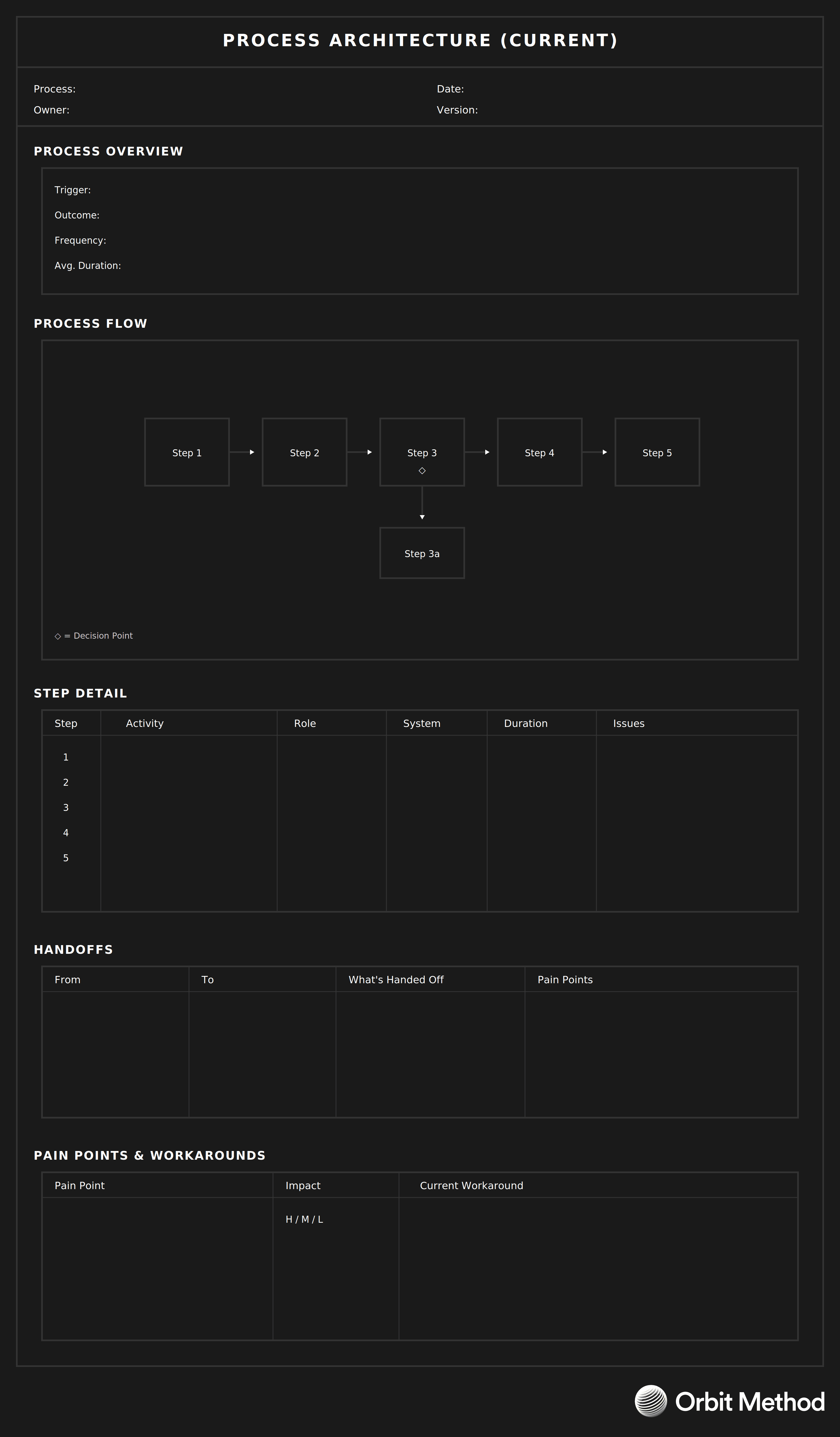 Before redesigning processes, you need to understand them as they truly operate, not as documented. This captures how work flows through the organization today, including workarounds and friction.