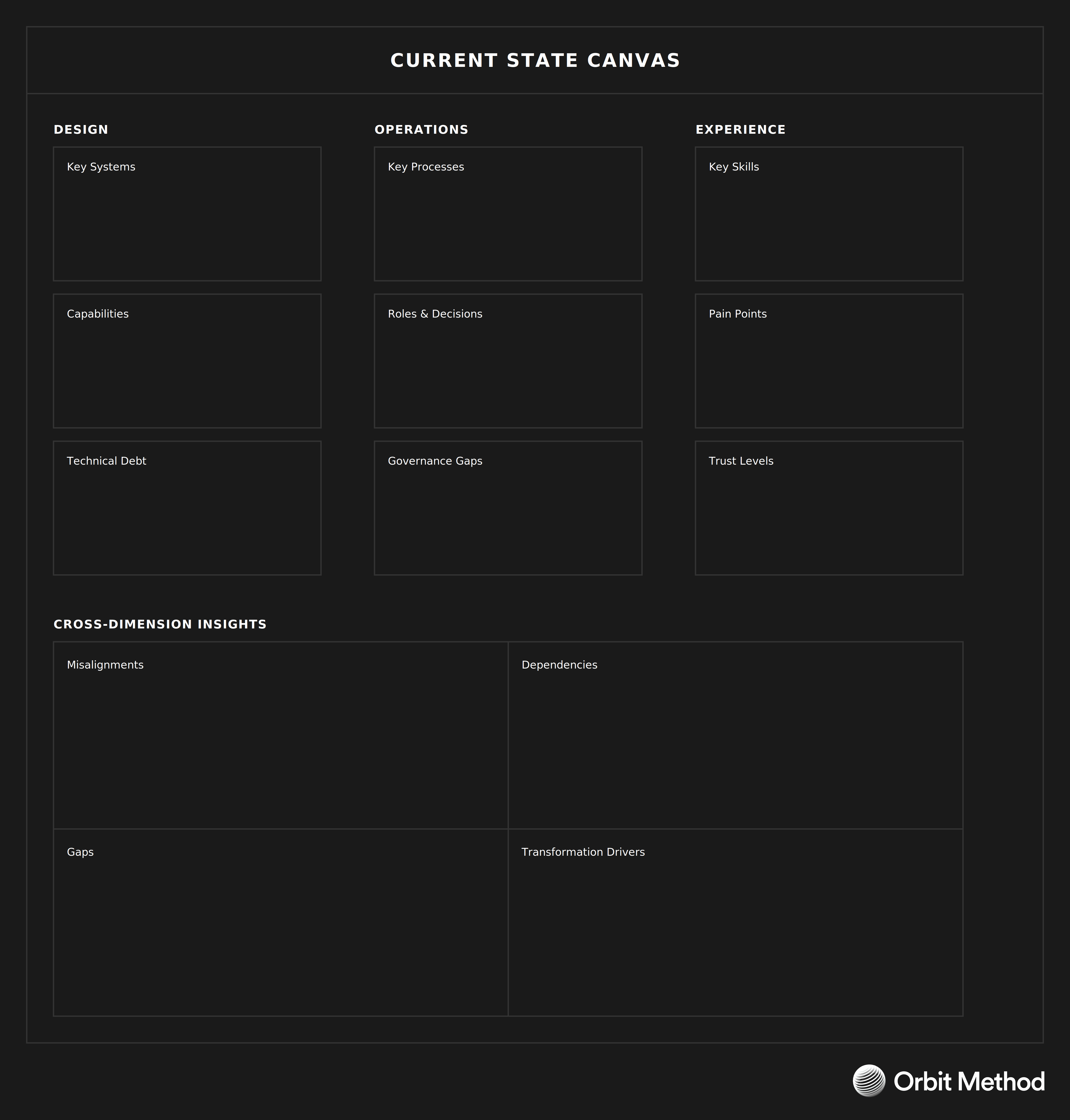 Before you can design the future, you need a shared view of today. The Current State Canvas brings together findings from all three dimensions into one integrated snapshot, revealing where gaps exist and where dimensions are misaligned.