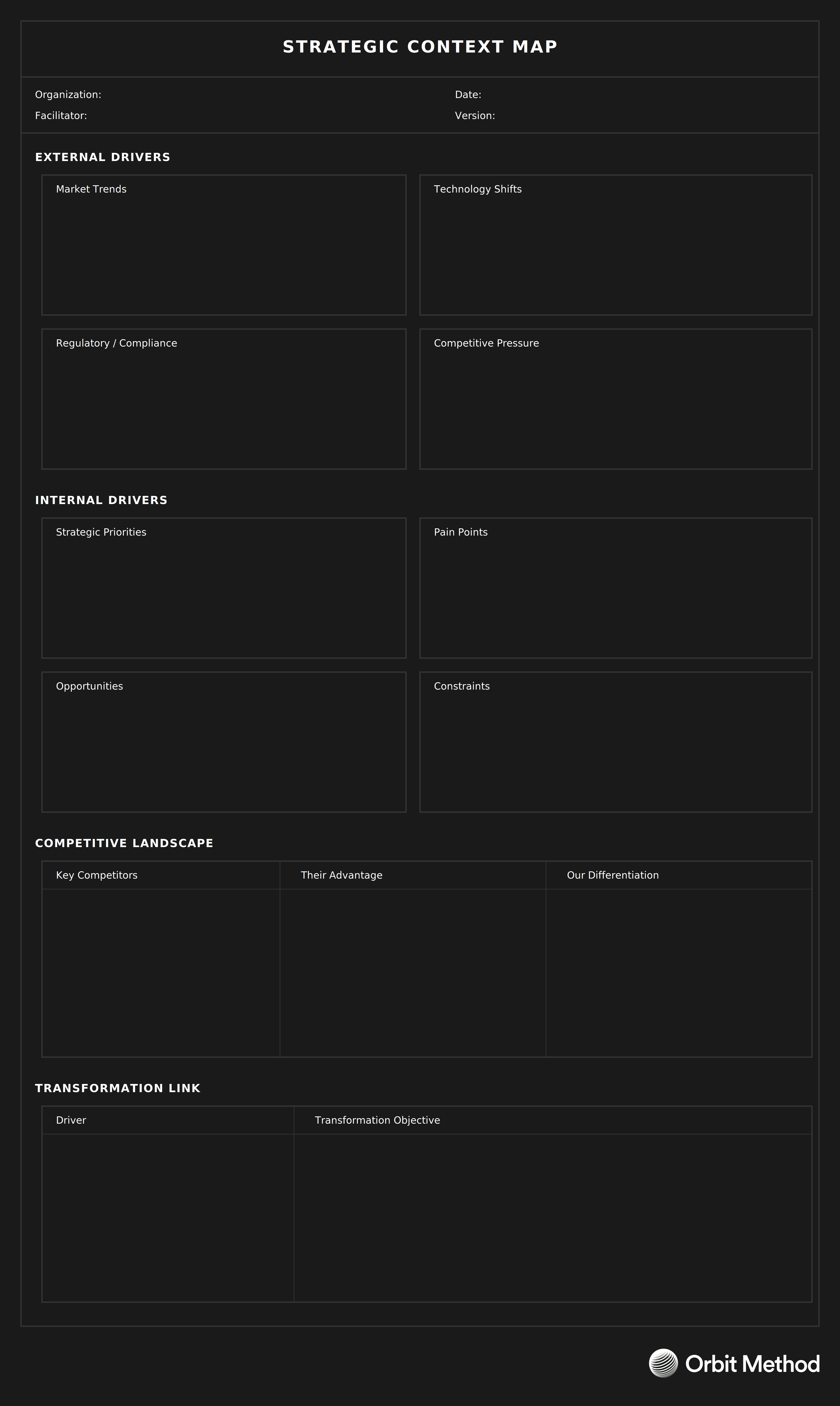 Transformation doesn't happen in a vacuum. The Strategic Context Map captures the external and internal forces that shape why change is needed and what success looks like. It creates shared understanding of the landscape before diving into detailed analysis.