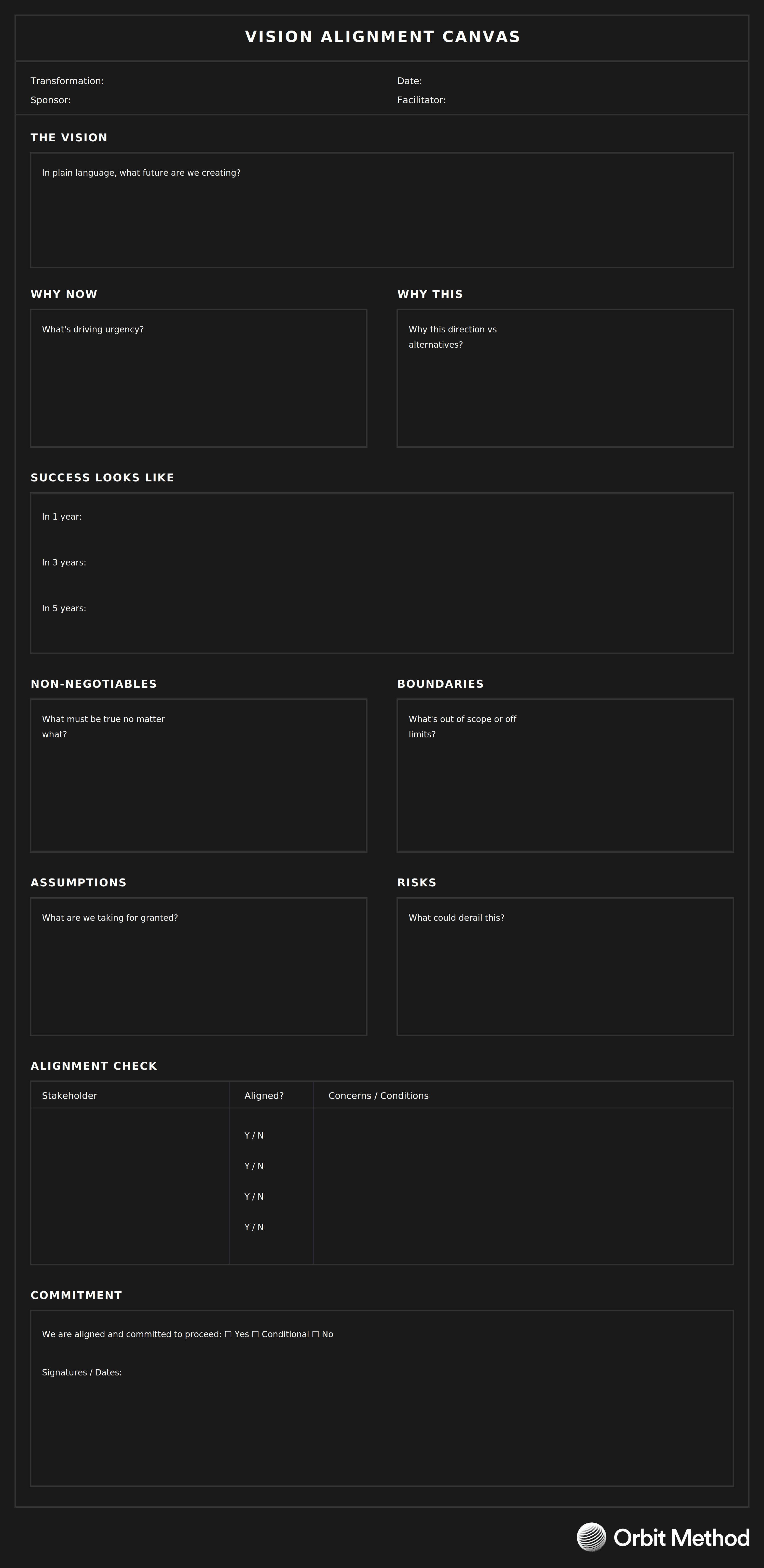Orbit is a method for execution, not vision creation. But execution without alignment leads to wasted effort. This exercise ensures stakeholders share a common understanding of where the organization is headed and why, providing a stable foundation for the work that follows.